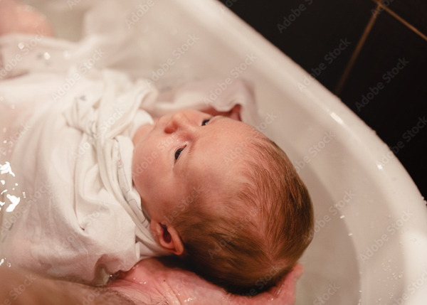 Puis vient le moment du bain : votre bébé est emmailloté pour plus de confort et de bien-être, dans une atmosphère douce et apaisante.